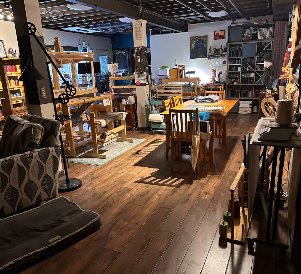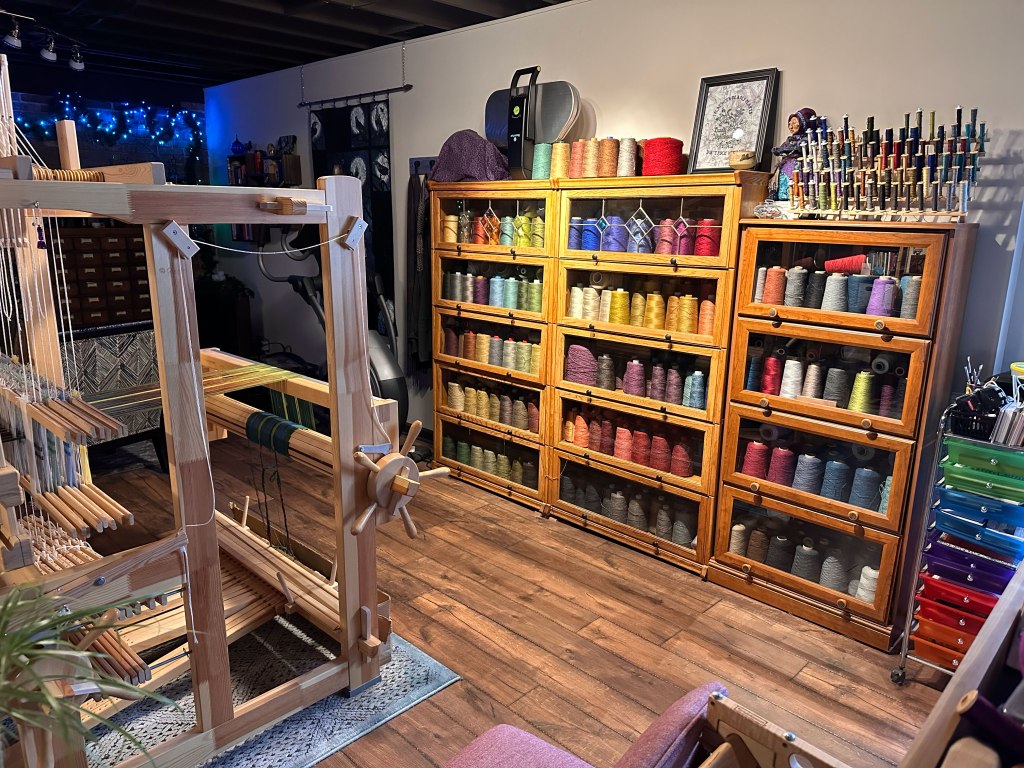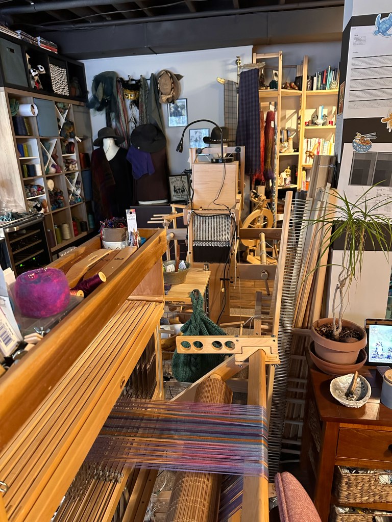 This corner has a lot going on. From the bottom right is my Lendrum spinning wheel. Above that hang some lovely warps ready to be woven. The cabinet is an expandable sewing station with sewing machine and serger. There are some dress forms and hooks on the wall that are wearing items I’ve made. My inspiration wall is half of my fiber stash. I like to have to open to look at and allow myself to design in my head until it needs to become an actual garment. I have the fibers on cones categorized by content. Most of the skeins are knitting/crotchet projects. I have spend the last couple of years gathering all my tools and supplies so that I can simply focus on creation after retirement, Top shelf is indeed several badgers and a paper mâché mushroom. And peeking out of the left of the photo is my wine fridge.