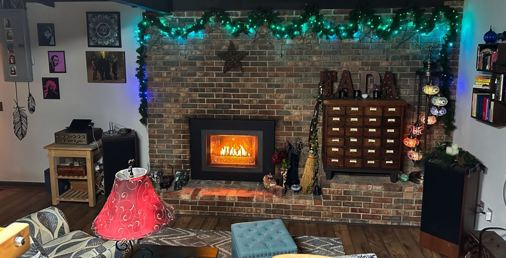 The brick wall was built with the house. It used to have a cast iron fire fireplace that we switched to a cleaner gas insert. Found an old card catalog that I refinished that houses much of my art supplies. A stereo and good speakers for listening to music, and two comfy chairs complete this area.
