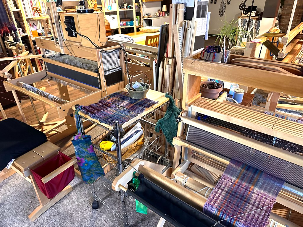 These are my two smaller looms. They are both allow me to weave pieces about 24″ across. The Louet Magic Dobby loom on the left has 24 shafts, so it allows me to create the most complex patterns. I use a computer to tell the loom which shafts to lift for the pattern, where the other looms all have treadles (peddles) I control with my feet. The Baby Wolf on the right is the first look I bought myself after learning on a beautiful 4 shaft Leclerc Fanny. I have a piece of deflected double weave fabric I’m working on from a workshop. On the table in between are some finished sample piece from this project.