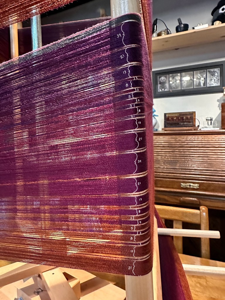 There are 3 colors blended in the image above. Eggplant to Fuscia to Spice. I started the sequence with the darker eggplant at 34 wraps around my warping loom. After the initial block of eggplant, I brought in the next color, fuscia, with a single strand. Then I alternated the two colors until I completed the sequence for the eggplant. I work down from 34 to 1 with eggplant. Fuscia gets worked up from 1 at the same time. Then I stopped using eggplant and brought in spice.