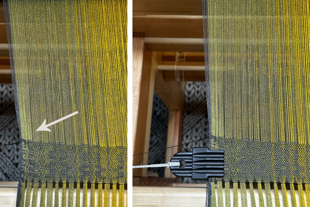 This system uses plastic clips. The bottom of the top part is serrated, but it’s dull so that it doesn’t pierce the fabric. Very nice to protect the edges. There’s a cord on the end that goes through two eyebolts I’ve put onto the loom. I know that some weavers would be horrified that I’m drilling holes into my beautiful Glimakra Standard loom and modifying it, but golly gee, I’m pretty sure the loom is thrilled to be of even more use. Tools are designed to allow you to modify them to make them into what you need them to be. Wee Glenna seems pleased that I’m back to weaving!