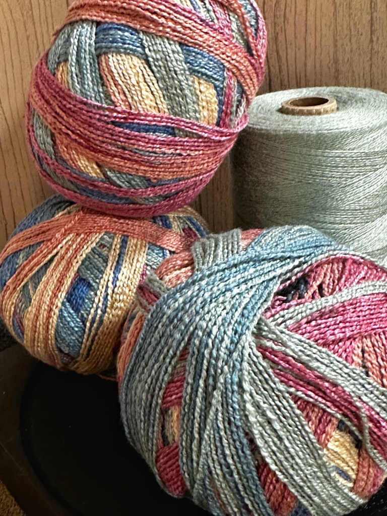 This soft bamboo yarn is the first to capture my attention. I start with the balls of sherbet color color strands. And on my bamboo shelf, I found the best complimentary solid color to use. I want a wide warp of colors here, with solid color for the pattern.