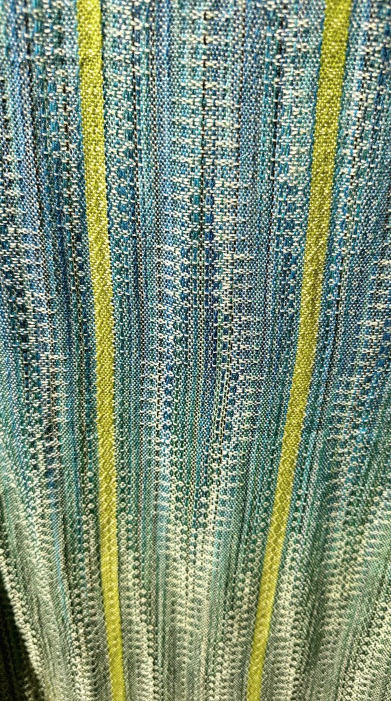 I loaded up my loom at the end of 2023 with a gorgeous hand dyed warp the flowed like a trip down a river; browns to greens to blues. I chose a favorite intricate pattern for it called Crackle because of how the pattern is broken into small pieces that make the whole. I picked three different colors for wefts; silvery blue, cream, and bark brown. Each color was used to made a separate scarf. I’d taken these off the loom and folded them and set them aside for finishing. And then I became busy with other things and they sat patiently waiting to be done. Today, I finished the project and gave them a proper photo shoot!