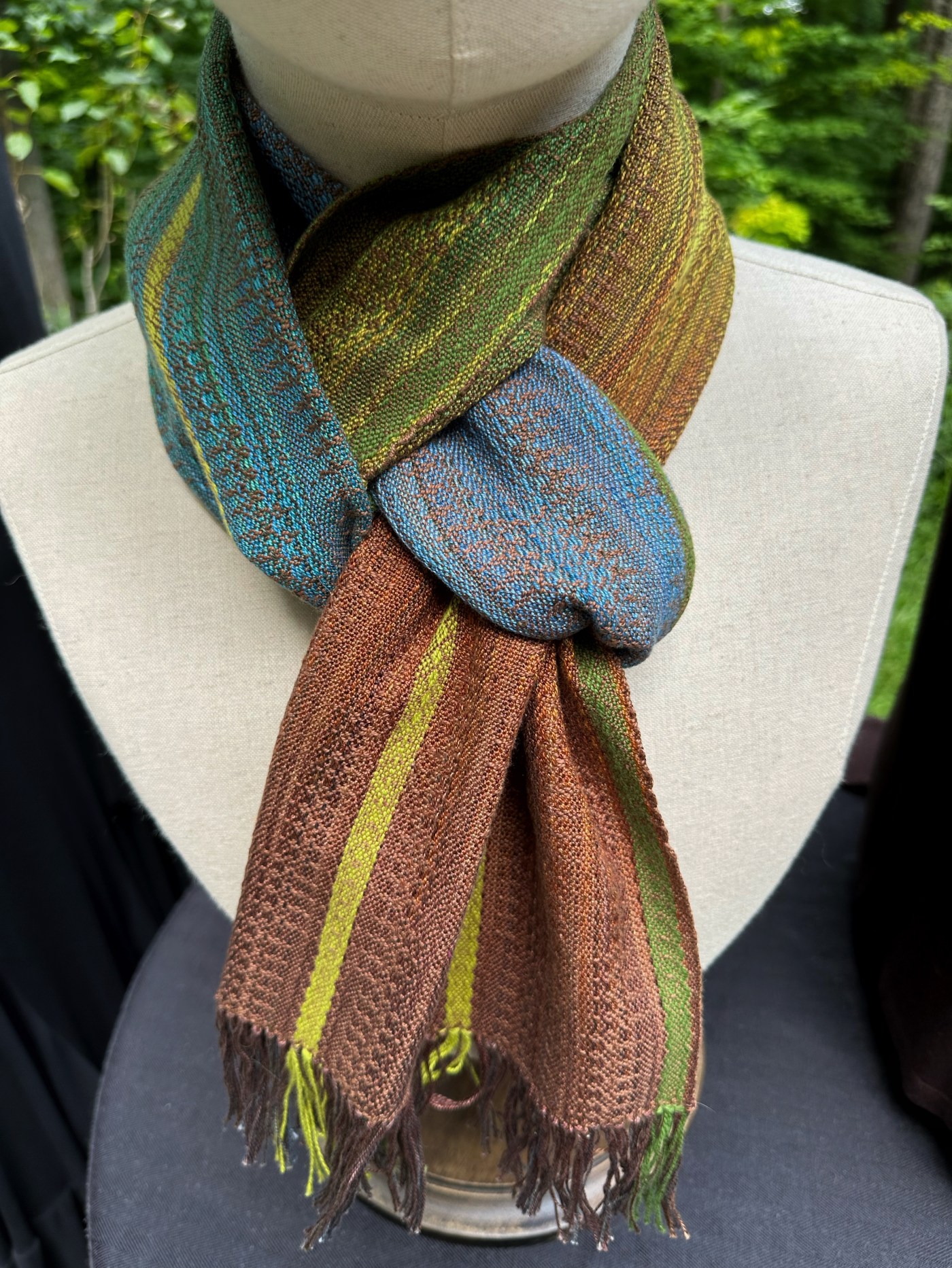 This versatile cotton scarf moves from a river of perfect blues, to the gorgeous greens and luscious browns of the shoreline. The rich brown of nurturing earth creates the intricate crackle pattern. The colors on this scarf are magically rich and show off the two lime green and two acid green stripes that break up the pattern.